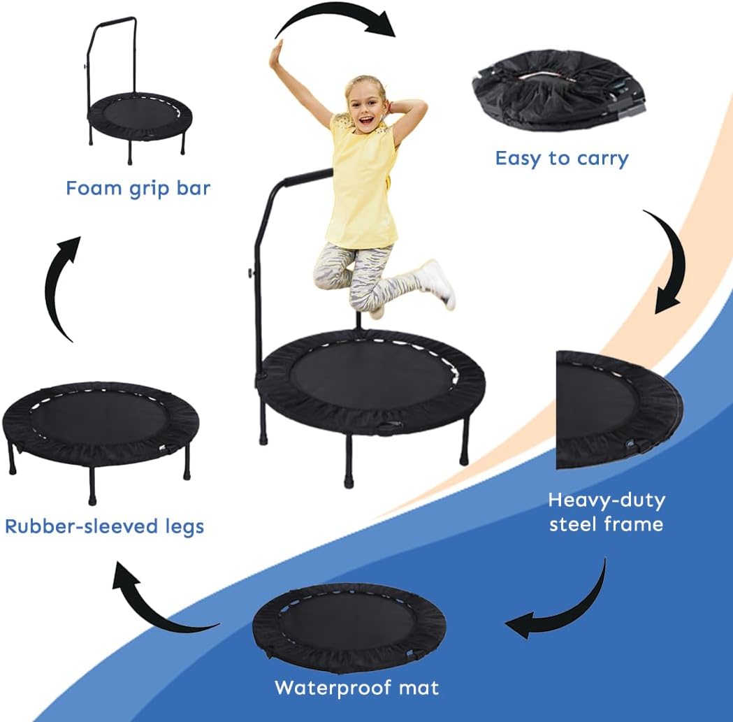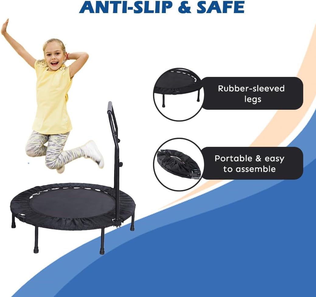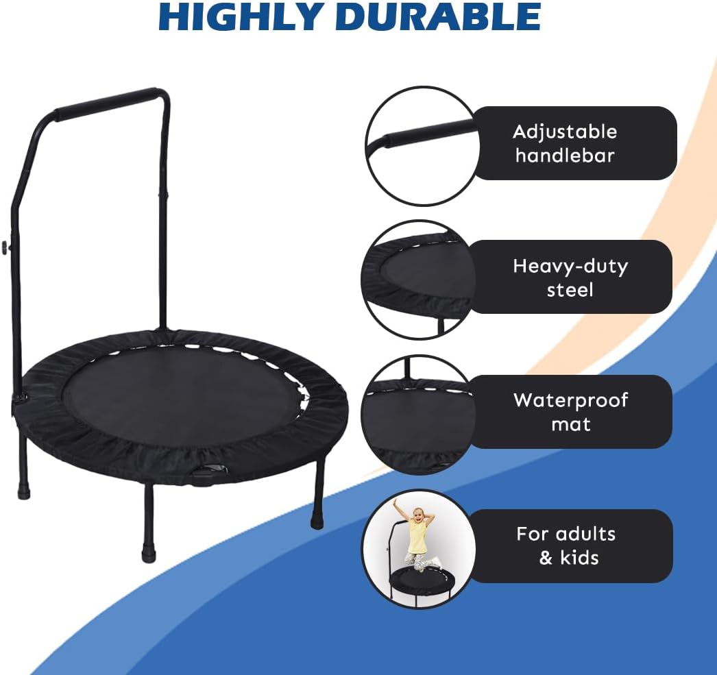 HIGHLY DURABLE: This mini trampoline for adults and kids, the frame of the trampoline is made of heavy-duty steel and the waterproof bungee mat is attached to the frame with steel springs, which absolutely improve the stability. The adjustable foam handle and strong legs with rubber sleeves make the trampoline non-slip and safe.