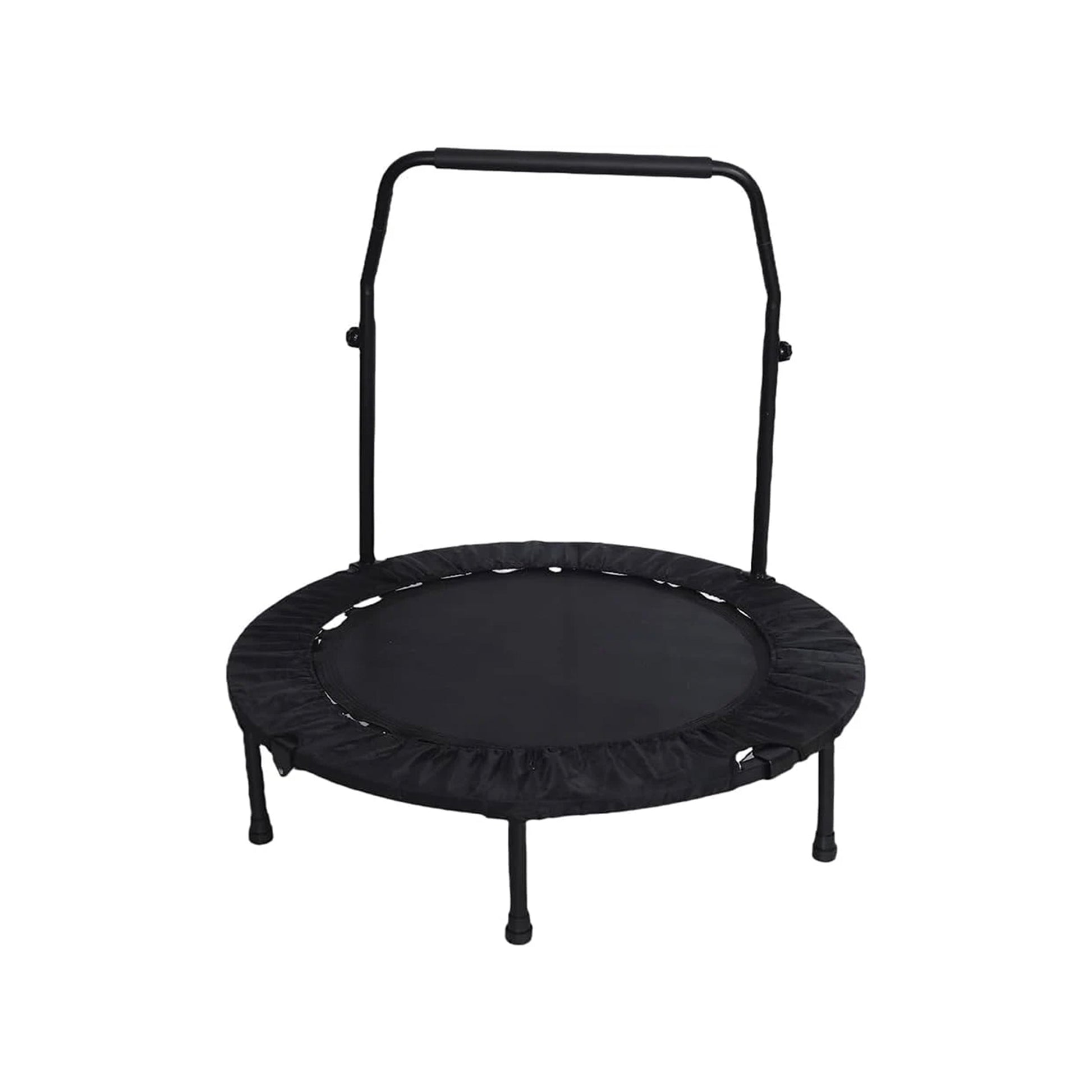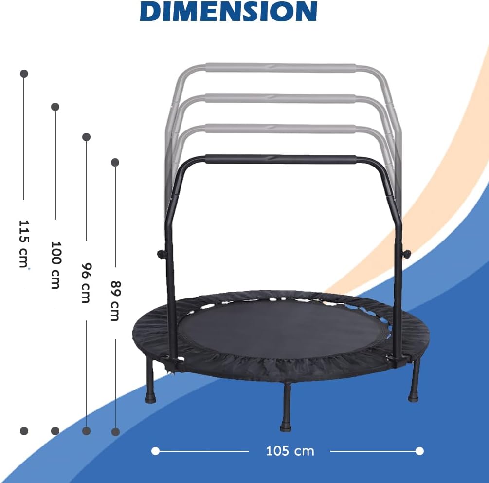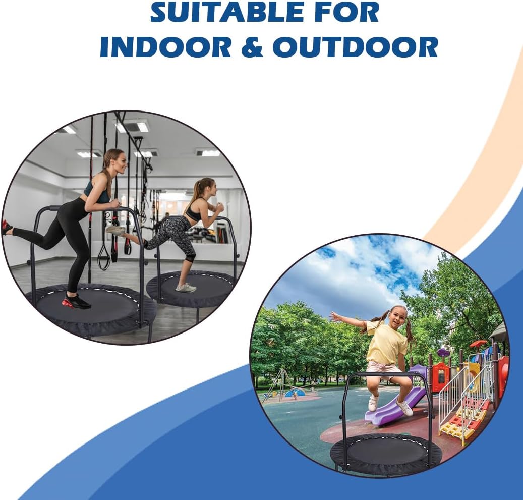 HIGHLY DURABLE: This mini trampoline for adults and kids, the frame of the trampoline is made of heavy-duty steel and the waterproof bungee mat is attached to the frame with steel springs, which absolutely improve the stability. The adjustable foam handle and strong legs with rubber sleeves make the trampoline non-slip and safe.