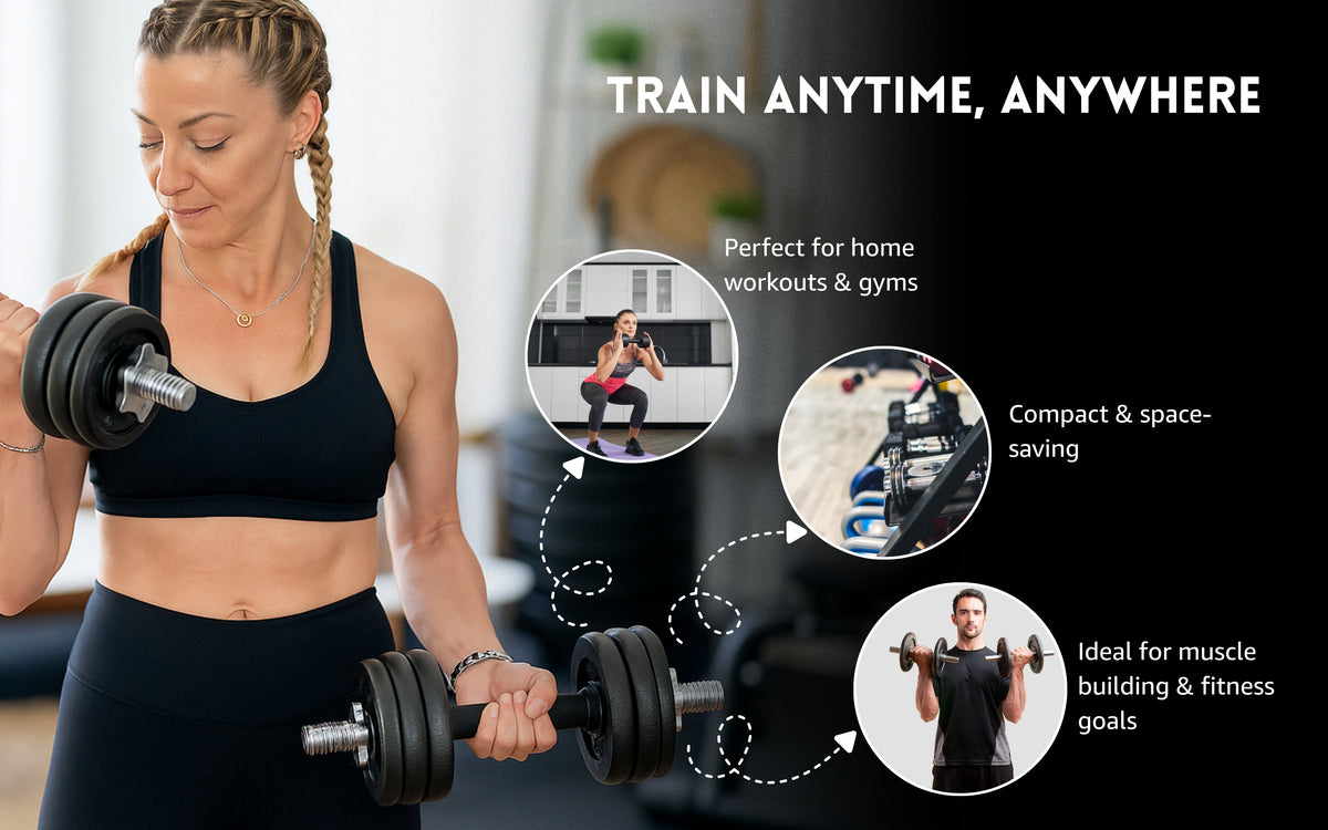 VERSATILE WEIGHT RANGE: With adjustable weight plates, this set offers versatility from light to heavy lifting and is suitable for different fitness levels and workout routines.