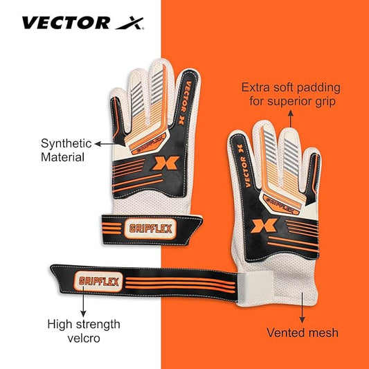 Vector X Gripflex Goalkeeper Gloves for Kids, Youth, Goalkeeper, Field Player Gloves, Embossed, Non-Slip Latex Palm, Soft Polyurethane Back, White, Black, Orange, Size 5