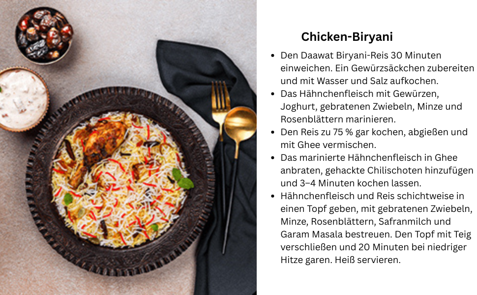 - Premium-Qualität: Unser Daawat Biryani Basmatireis ist bekannt für seine außergewöhnliche Qualität und Aromen, die aus den feinsten Basmatireiskörnern gewonnen werden. Wir holen die feinsten Körner auf, um Ihnen feinste Basmati zu servieren. Jede Packung wird nach Chunkar, Bachakar, Sambhalkar und Sajaakar zubereitet, um Ihnen das längste Reiskorn zu servieren.
