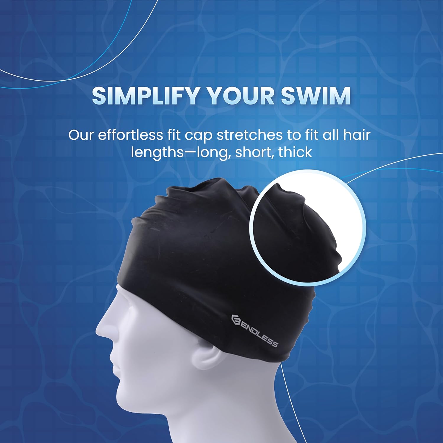 Endless EL1019 Klassische, bequeme, schlichte Badekappe aus Silikon | Schwarz | Vollelastische, wasserdichte Badekappe für langes und kurzes Haar mit dickerem Rand | Für Erwachsene, Frauen und Männer