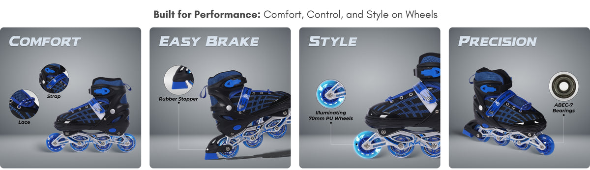 AUFFÄLLIGE PU-RÄDER: Verfügt über eine Kombination aus leuchtenden 70-mm-PU-Rädern, wobei das erste Rad für ein stilvolles Aussehen konzipiert ist.