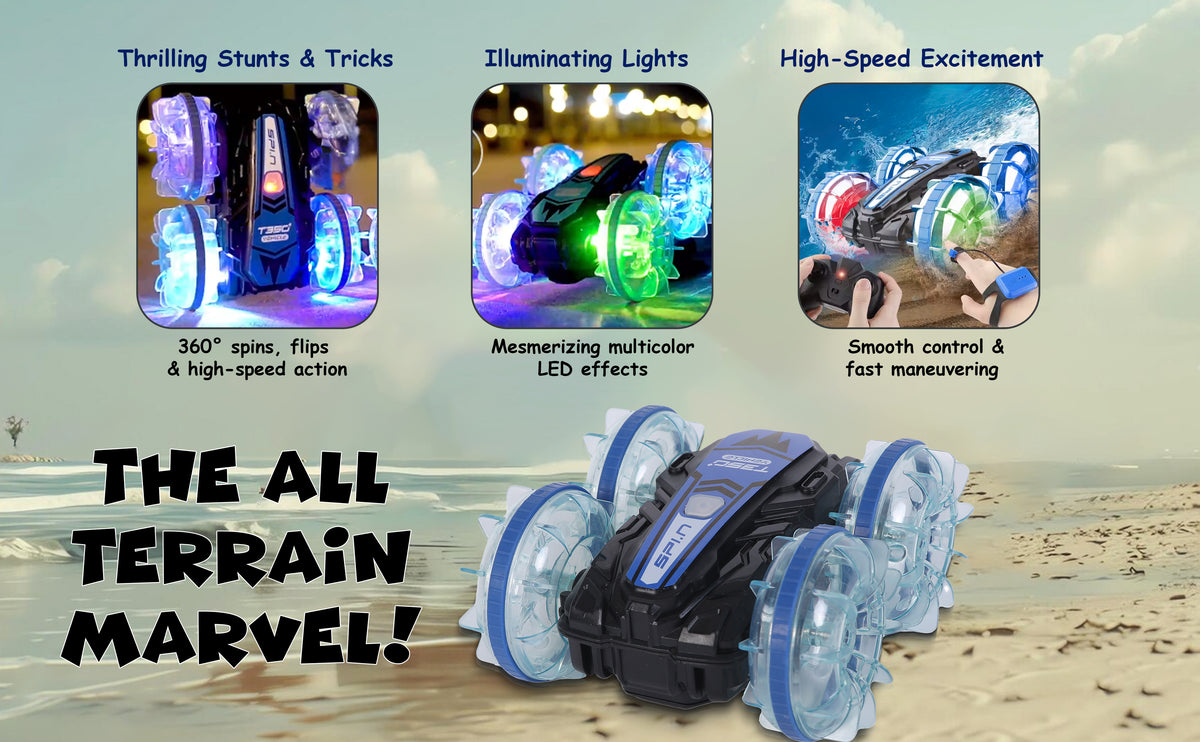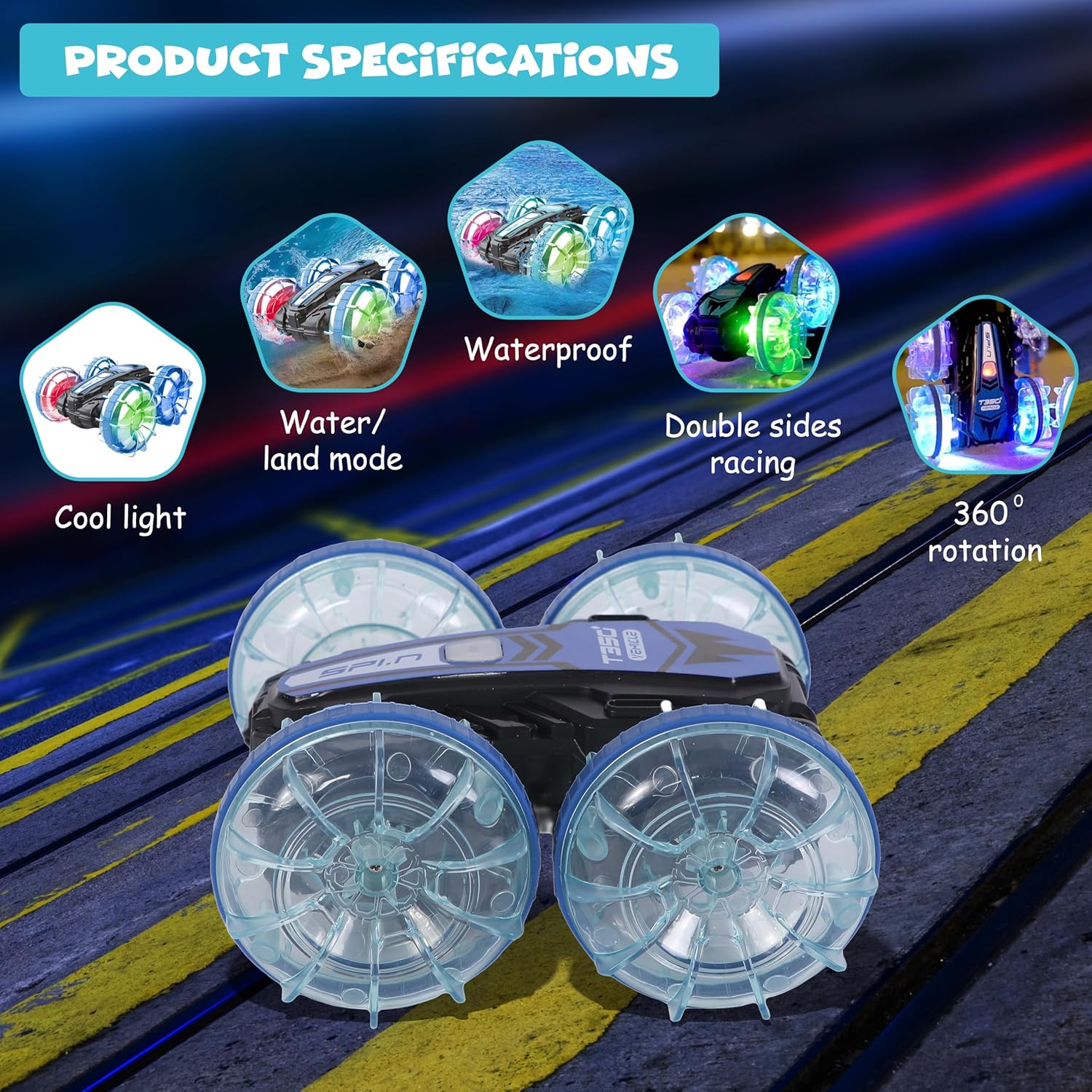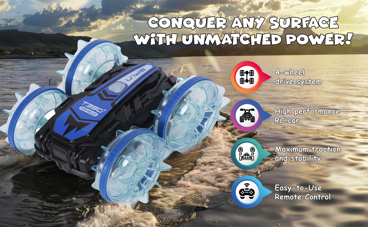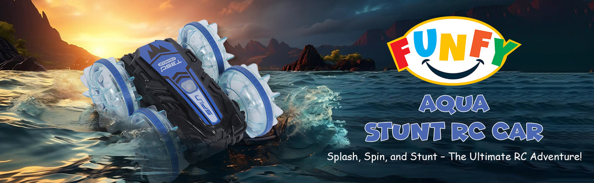 - AQUA STUNT RC CAR: Das Funfy Aqua Stunt RC Car ist für spannende Stunts und Hochgeschwindigkeits-Action konzipiert und kann sowohl an Land als auch im Wasser beeindruckende Tricks ausführen.