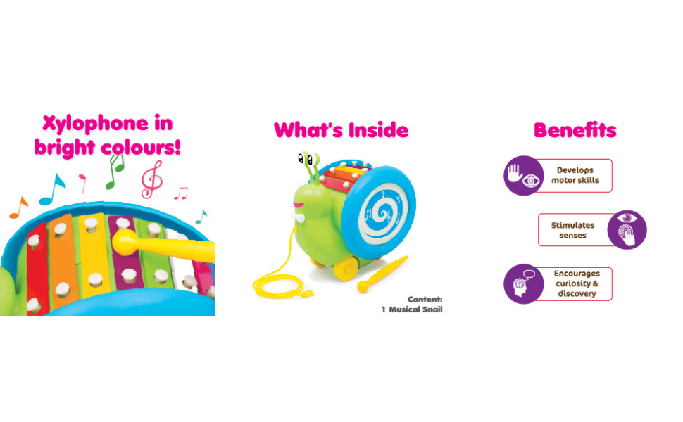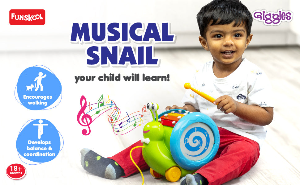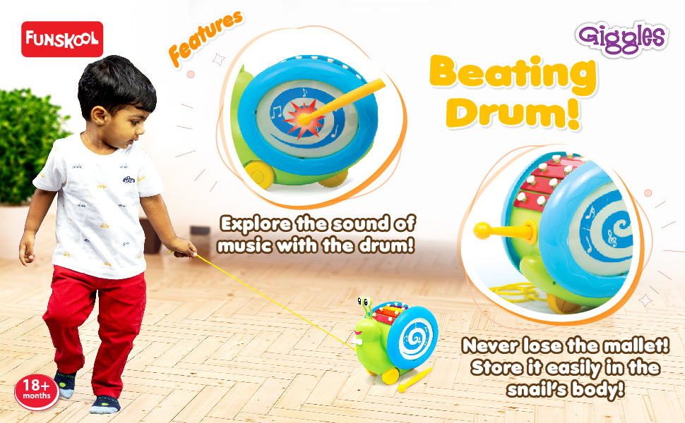 - INTERAKTIVES MUSIKSPIELZEUG: Die Funskool Pull Along Musical Snail verbindet Bewegung mit Musik und sorgt so für spannenden Spielspaß. Mit ihrem bunten Xylophon-Gehäuse und den Trommelbasen an beiden Seiten können Kleinkinder mit dem mitgelieferten Schlägel Melodien erzeugen, was ihre sensorische Entwicklung und ihre musikalischen Fähigkeiten fördert.