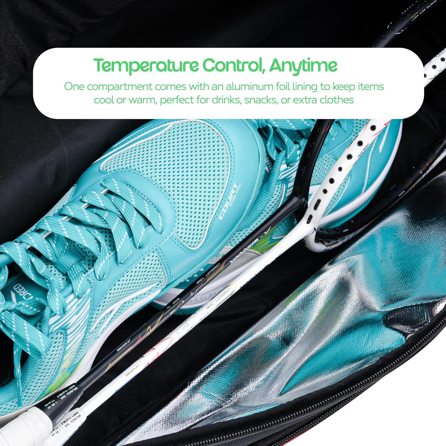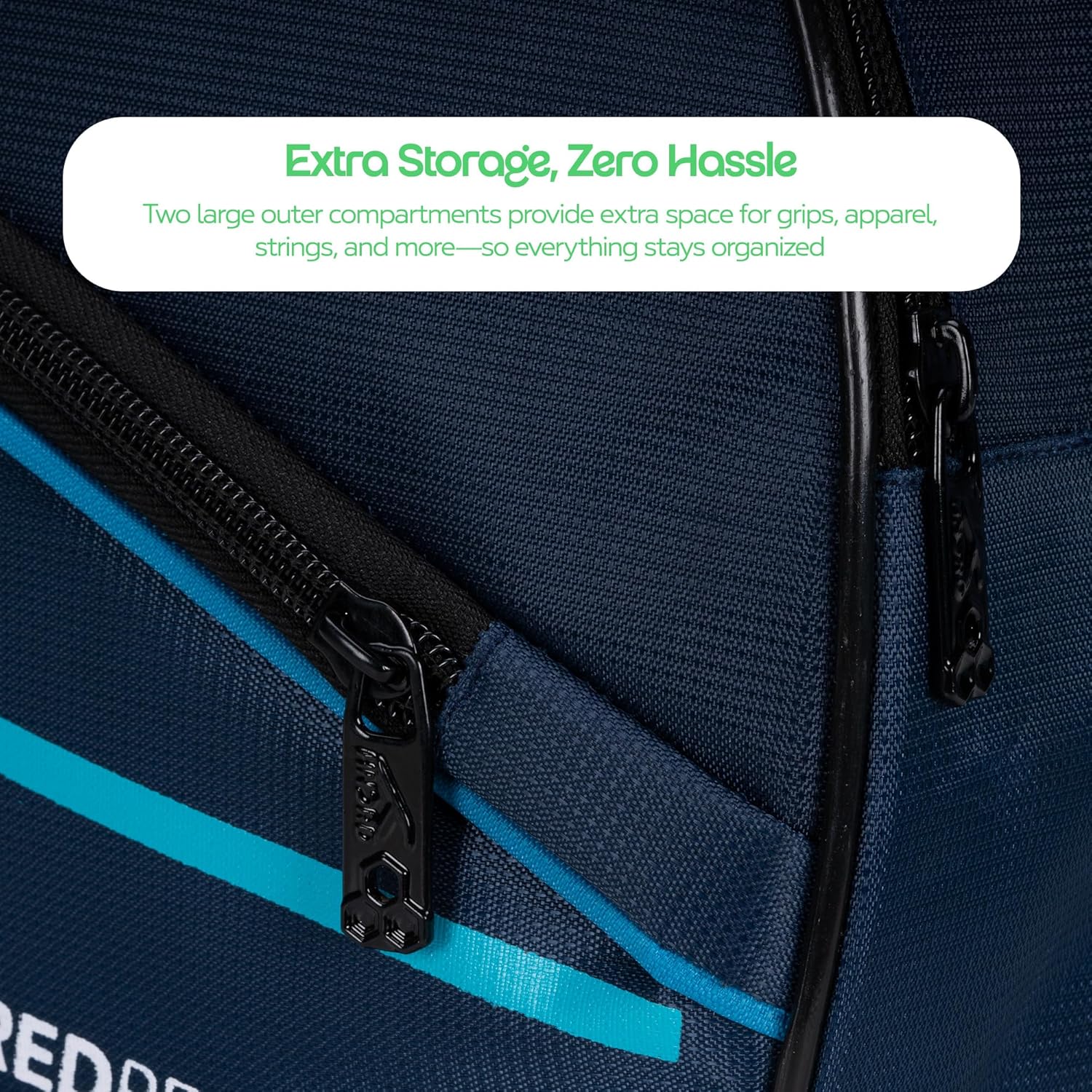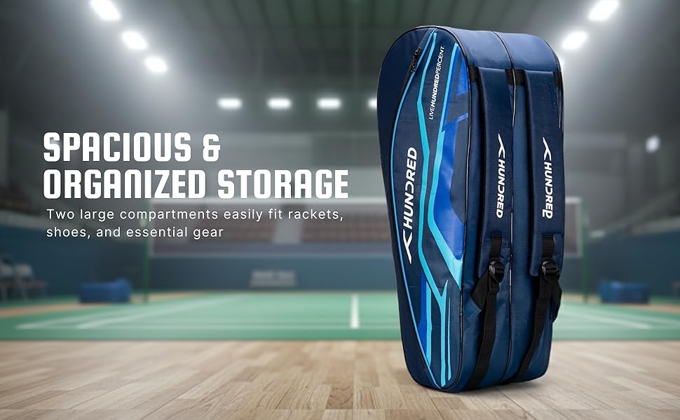 GERÄUMIG UND ÜBERSICHTLICH Zwei große Fächer für Schläger, Schuhe und Ausrüstung.
