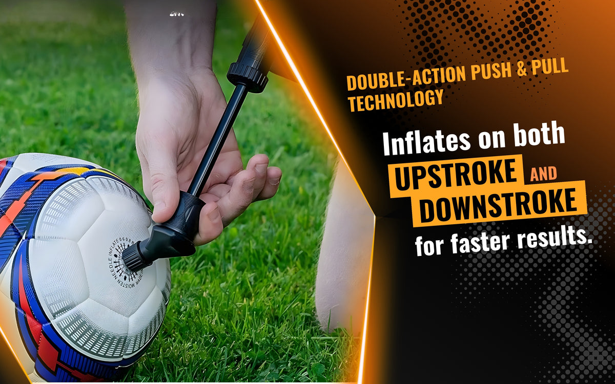 - Doppelt wirkende Push- und Pull-Technologie: Diese Ballpumpe verfügt über einen doppelt wirkenden Mechanismus, der es ihr ermöglicht, Luft sowohl beim Auf- als auch beim Abwärtshub zu pumpen, wodurch der Aufblasvorgang schneller und effizienter wird.