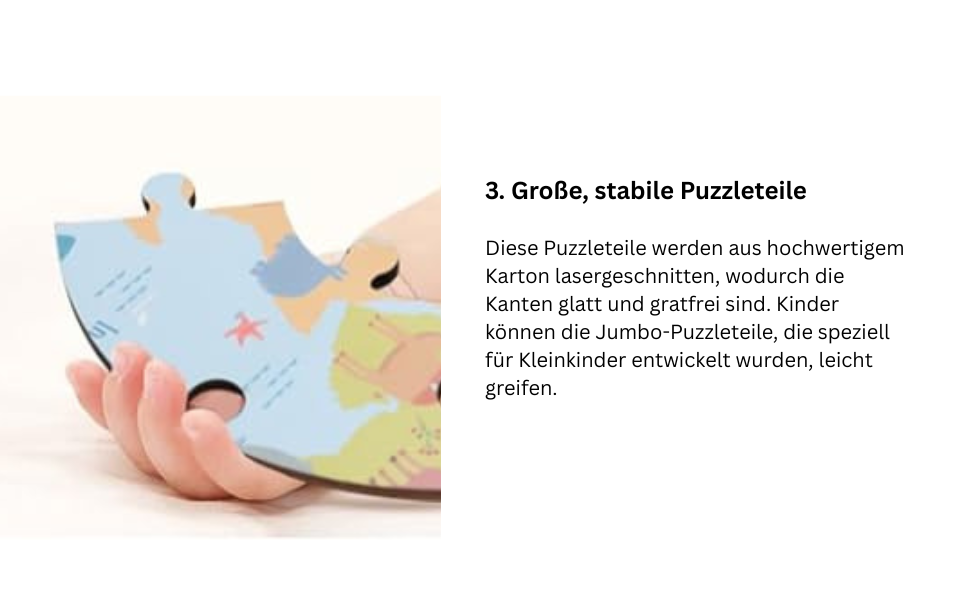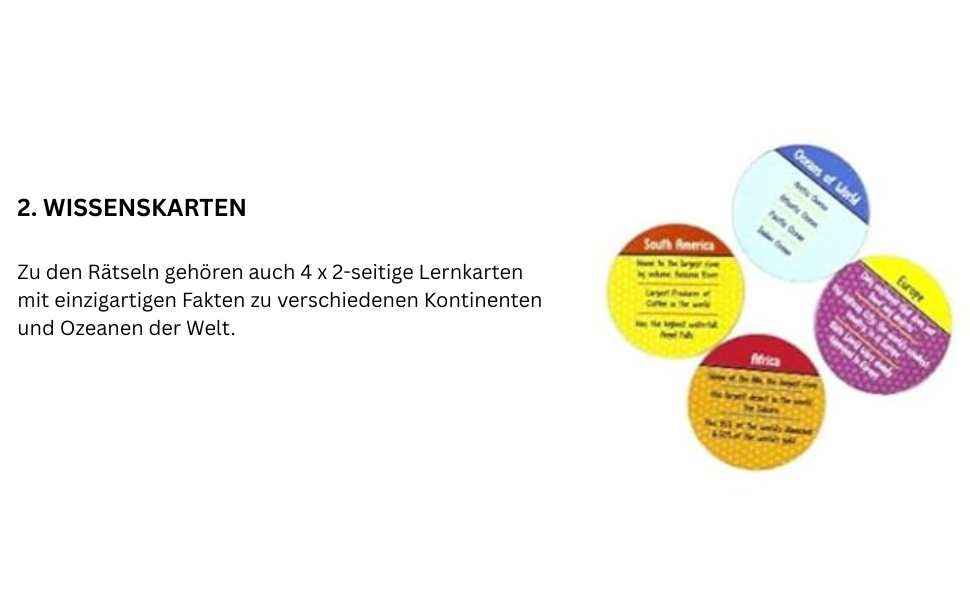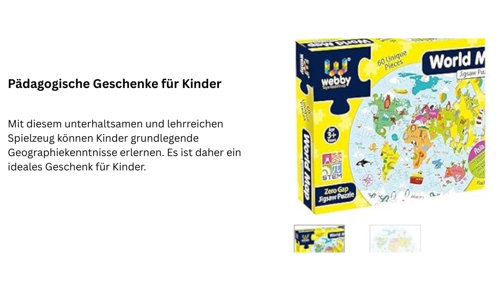 Bei Webby haben wir es uns zum Ziel gesetzt, Spielzeug neu zu definieren, um Kindern den bestmöglichen Wert zu bieten. Dieses Weltkarten-Puzzle wurde speziell in Indien entworfen und hergestellt, unter Berücksichtigung von Rückmeldungen vieler Kinder, Eltern und Lehrer. Das Puzzle hat eine charakteristische runde Form, im Gegensatz zu den meisten anderen Puzzles, die überwiegend rechteckig sind. Auch die Farben des Puzzles unterscheiden sich von herkömmlichen Puzzles, um Kinder anzusprechen. Mit 60 verschiedenen Teilen kann ein Teil nicht eingesetzt werden, wenn es nicht an der richtigen Position ist – aufgrund der einzigartigen Größe jedes Teils. Sie werden keine Lücken in den Puzzleteilen sehen, da wir eine Methode entwickelt haben, um Lücken vollständig zu vermeiden. Um den pädagogischen Wert zu erhöhen und Kinder zusätzlich zu begeistern, sind 4 doppelseitige Wissenskarten mit einzigartigen Fakten über Kontinente und Staaten im Lieferumfang des Weltkarten-Puzzles enthalten.