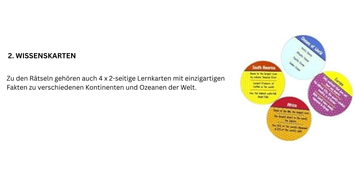 - Enthält 4 doppelseitige Lernkarten: Die Lernkarten vermitteln interessante Fakten über Kontinente und Ozeane und erweitern so das geografische Wissen der Kinder.