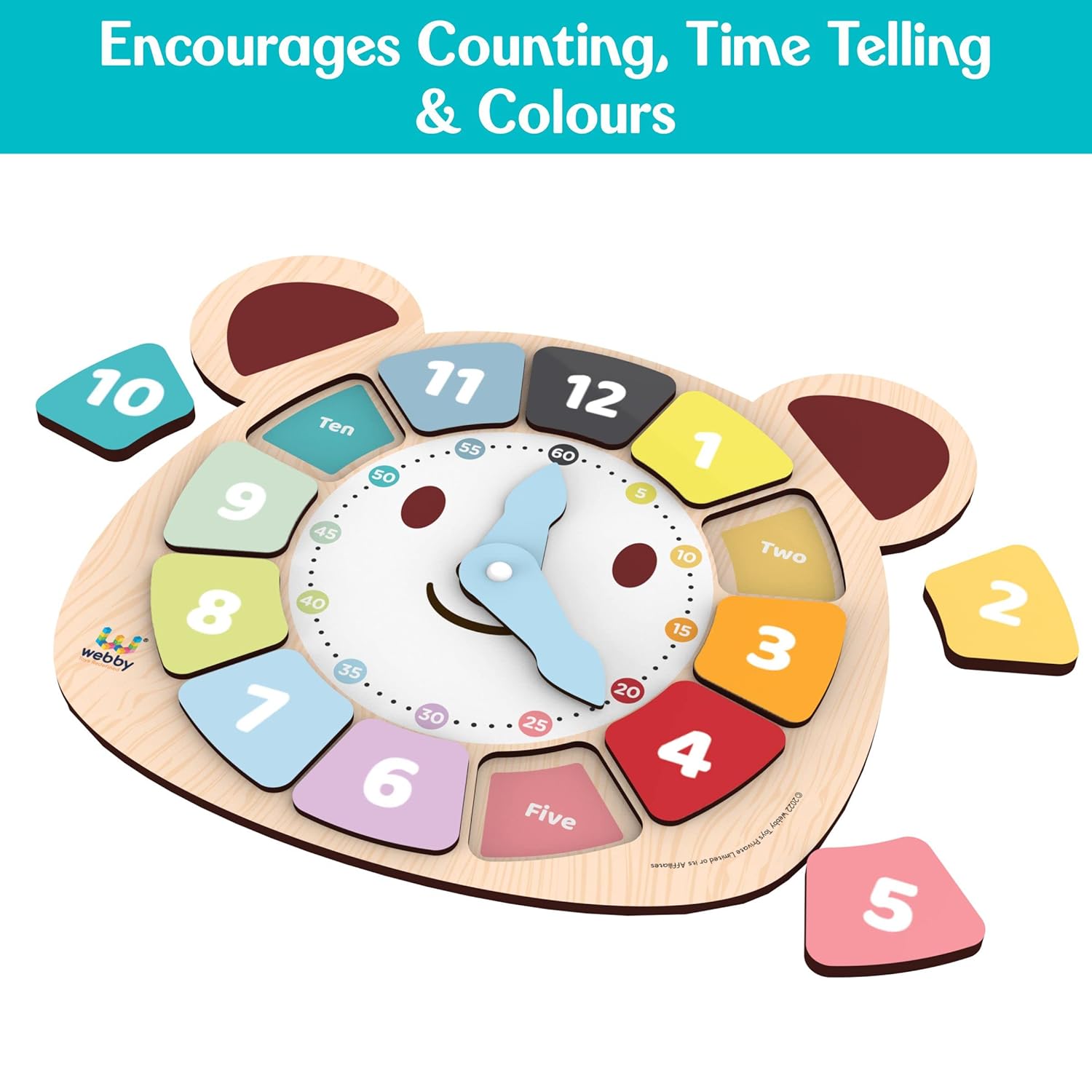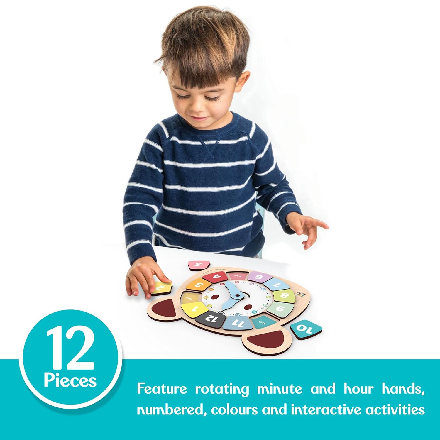 Webby Holzpuzzle zum Lernen für Kinder – 12-teiliges Sortierbrett mit drehbaren Zeigern – Lernspielzeug zum Erlernen von Zahlen, Farben und Feinmotorik – Mehrfarbig