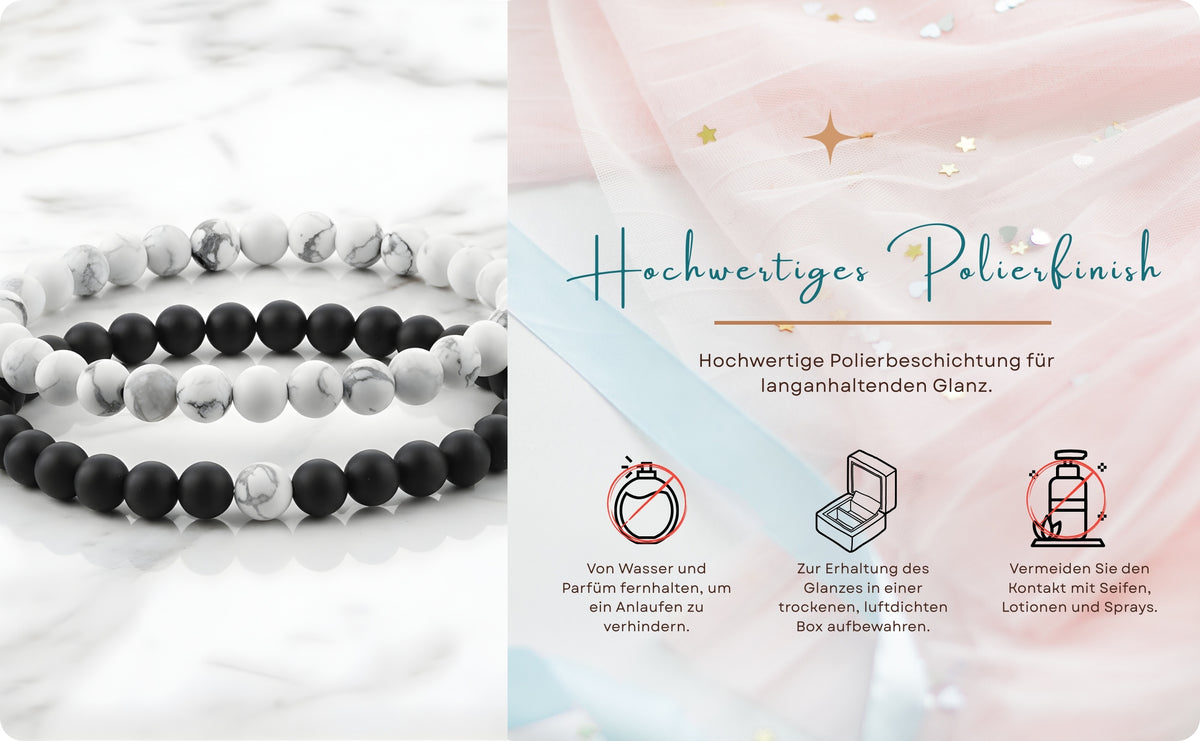 - Es ist ratsam, Schmuck in einem Zip-Beutel (luftdichter Beutel) aufzubewahren und ihn von Wasser, Parfüm und anderen Chemikalien fernzuhalten. Reinigen Sie ihn mit einem trockenen und weichen Tuch.